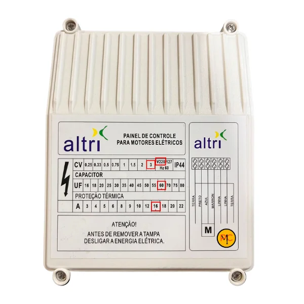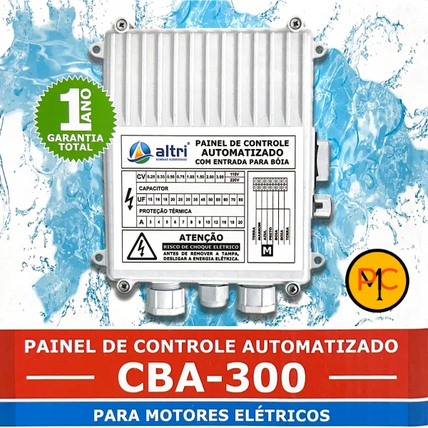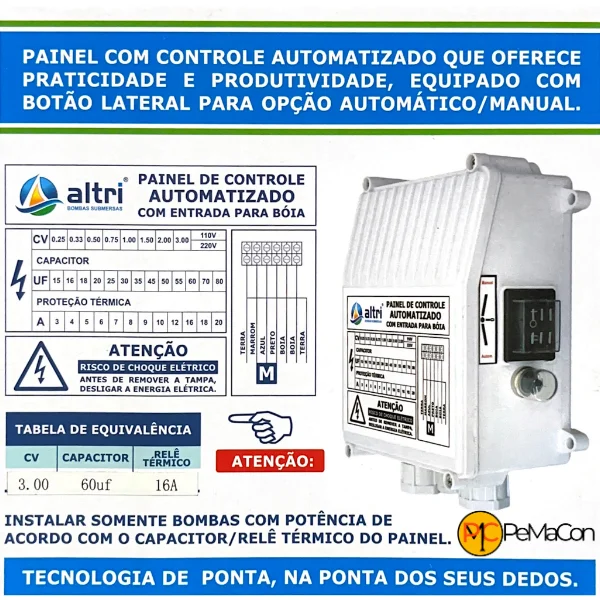 Painel de controle automatizado com entrada para boia que oferece praticidade e produtividade, equipado com botão lateral para automático/manual.