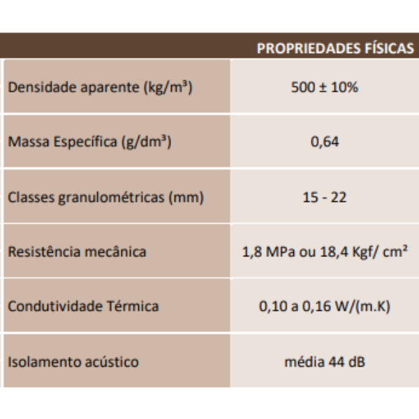 Em sua forma original, solta e sem aditivos, reduz em até 5 oC a temperatura interna do ambiente, proporcionando maior conforto térmico para as pessoas que o ocupam. Seu formato arredondado e sua porosidade interna contribuem para a dissipação do calor, mantém a laje estática e livre de eventuais patologias, ocasionadas por dilatação térmica, e aumentam sua vida útil. Idem para a impermeabilização.