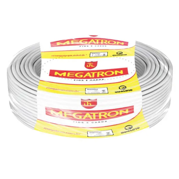 Cabo flexível branco da Megatron, ideal para instalações elétricas residenciais ou comerciais, com isolamento de PVC e resistência de até 750V. Perfeito para garantir segurança e eficiência nas suas construções e reparos elétricos.