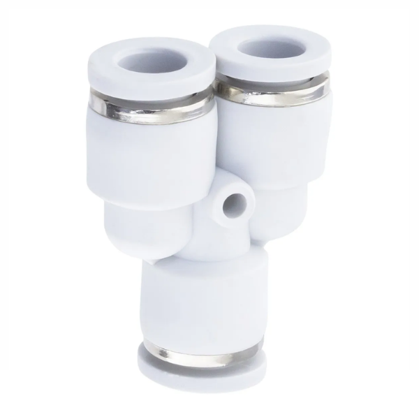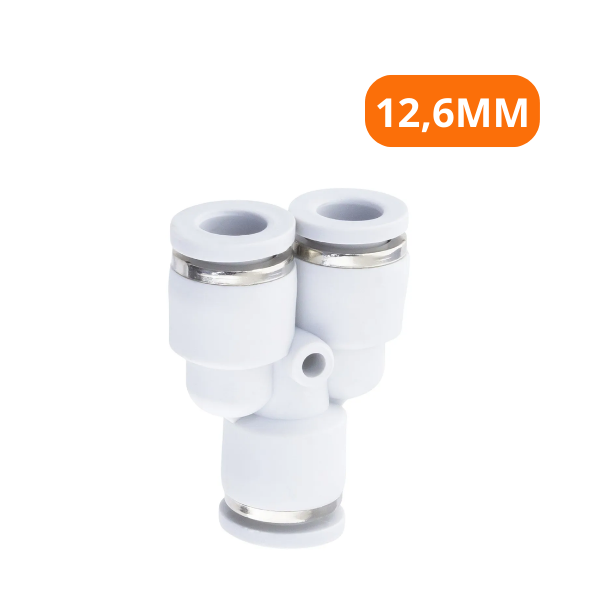 Engate rápido tipo “Y” para mangueira 12,6mm. Permite a conexão de duas saídas a partir de uma única fonte, facilitando a distribuição da água.