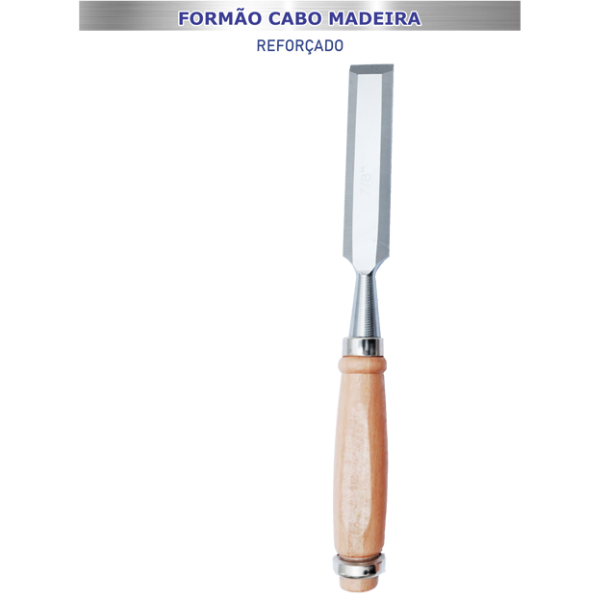 Formão reforçado, de lâmina reta, em aço cromo vanádio forjado e temperado, niquelado, cabo ergonômico de madeira especial tratada, lâmina chanfrada e polida, lamina de 5/8″, superfície ampla de golpe na borda do cabo, para entalhar e cortar madeiras.