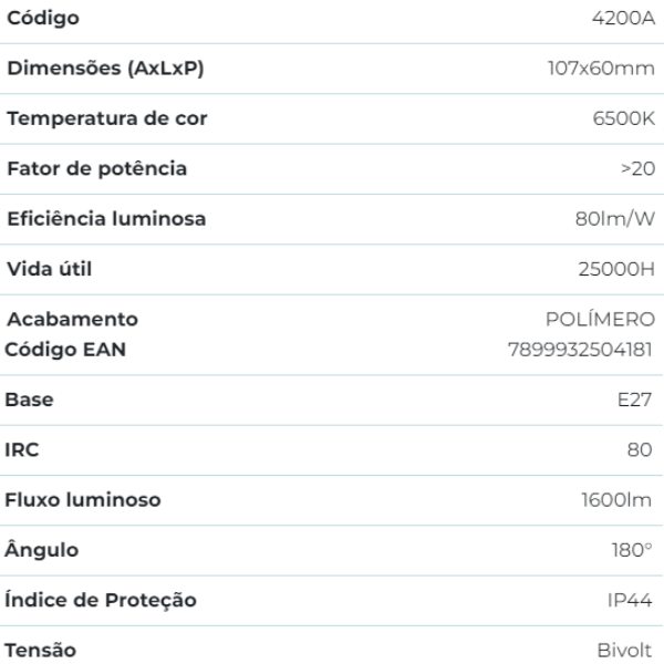 – Material: Corpo em Alumínio + Plástico e difusor em Policarbonato