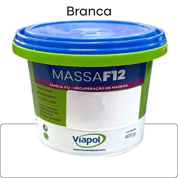 A Massa F-12 Viapol (cor branca) é uma massa acrílica pastosa indicada para rejuntamento de assoalhos e reparo/acabamento em superfícies de madeira (maciça, laminada e MDF). De fácil aplicação e lixamento, é solúvel em água enquanto pastosa e insolúvel após a secagem, permitindo pintura direta sobre a massa lixada sem necessidade de seladoras ou fundos especiais. <button class=”ms-1 flex h-[22px] items-center rounded-xl px-2 relative bottom-[-2px] bg-[#f4f4f4] text-token-text-secondary! hover:bg-token-bg-secondary dark:bg-token-main-surface-secondary dark:hover:bg-token-bg-secondary”></button>