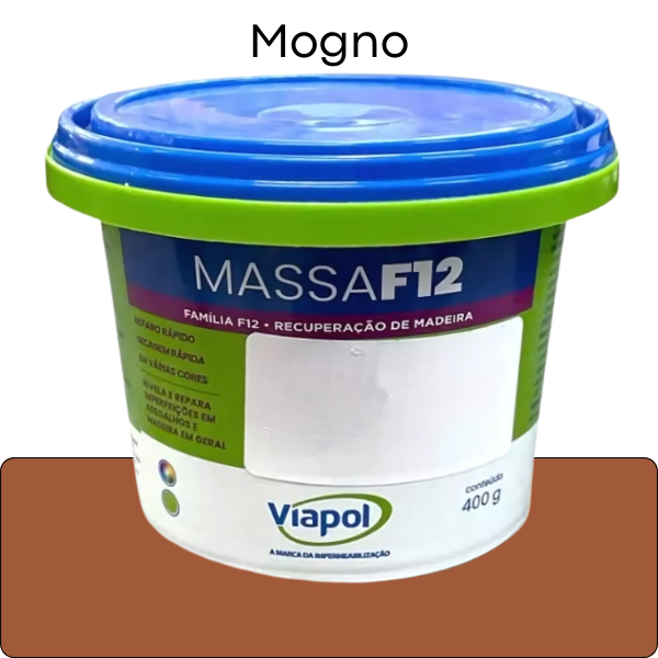 A Massa F-12 Viapol (cor mogno) é uma massa acrílica pastosa especialmente desenvolvida para rejuntamento de assoalhos e reparos/acabamentos em superfícies de madeira (maciça, laminada e MDF). De fácil aplicação e lixamento, é solúvel em água enquanto pastosa e torna-se insolúvel após a secagem, permitindo pintura direta sobre a massa lixada sem necessidade de seladoras ou fundos especiais.