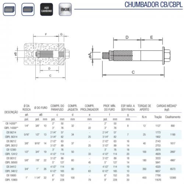 - Tipo: Parafuso Chumbador CB