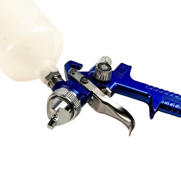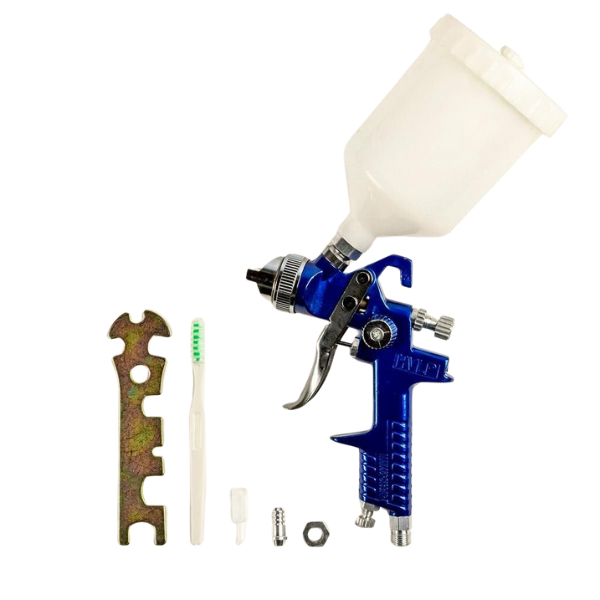 A pistola possui o sistema HVLP, alto volume e baixa pressão, que faz com que o jato superdirecionado pulverize a pintura de uma maneira mais fina e precisa, sem provocar nuvens de pintura