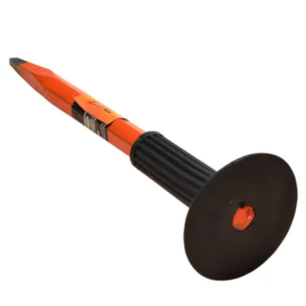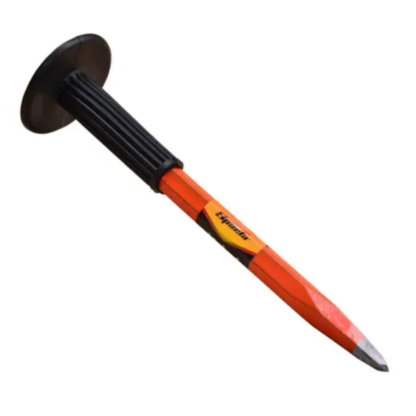 Utilizada em mecânicas, industrias e construção civil o ponteiro é produzido de aço inoxidável ?7. A dureza da ponta é de 52 HRc. Possui protetor de borracha para proporcionar maior conforto e principalmente proteção para as mãos do usuário à vibrações ou golpes acidentais com martelo/marreta.